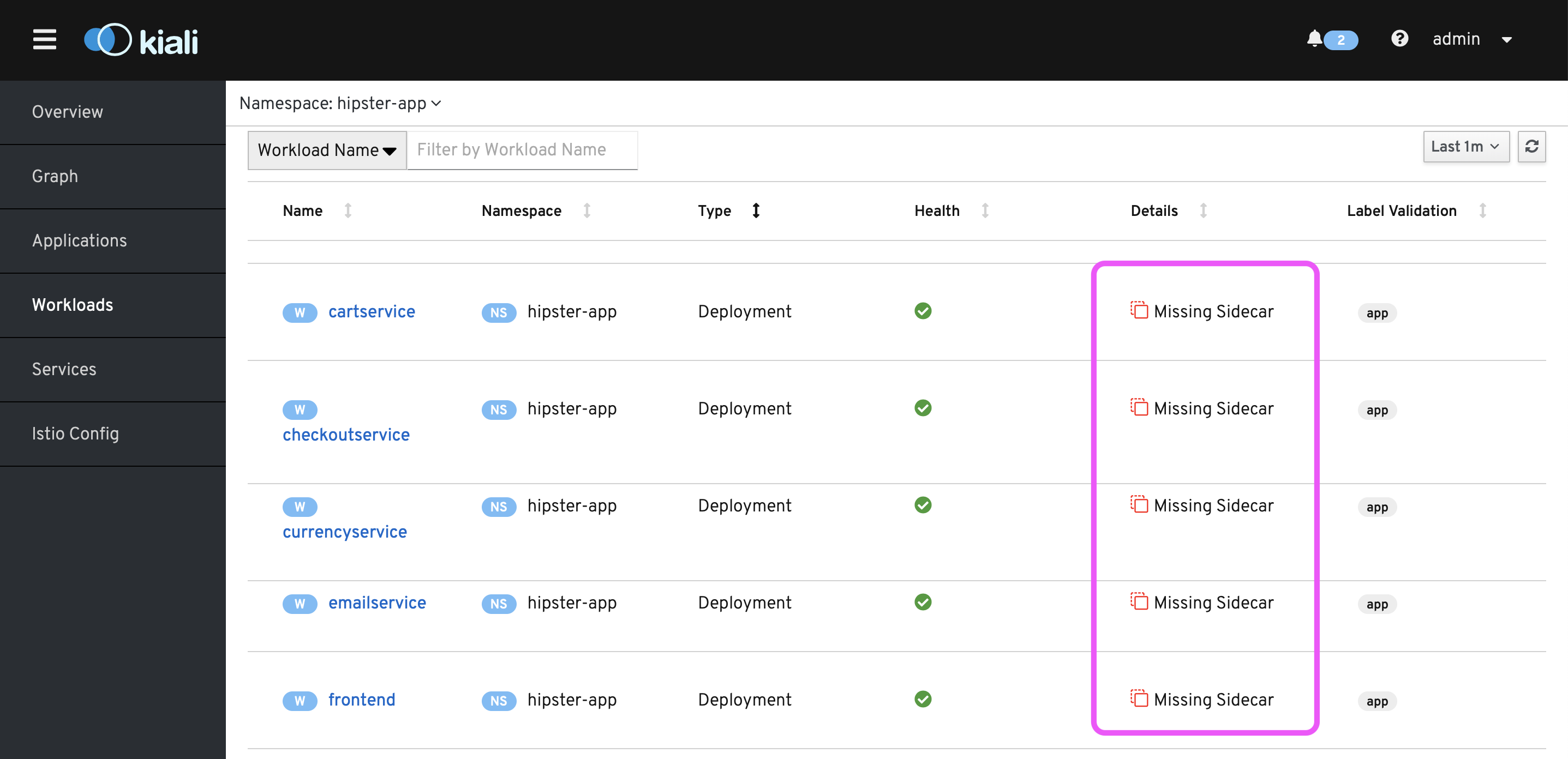 The workload tab show the the service are running without sidecars as we haven’t yet deployed the: